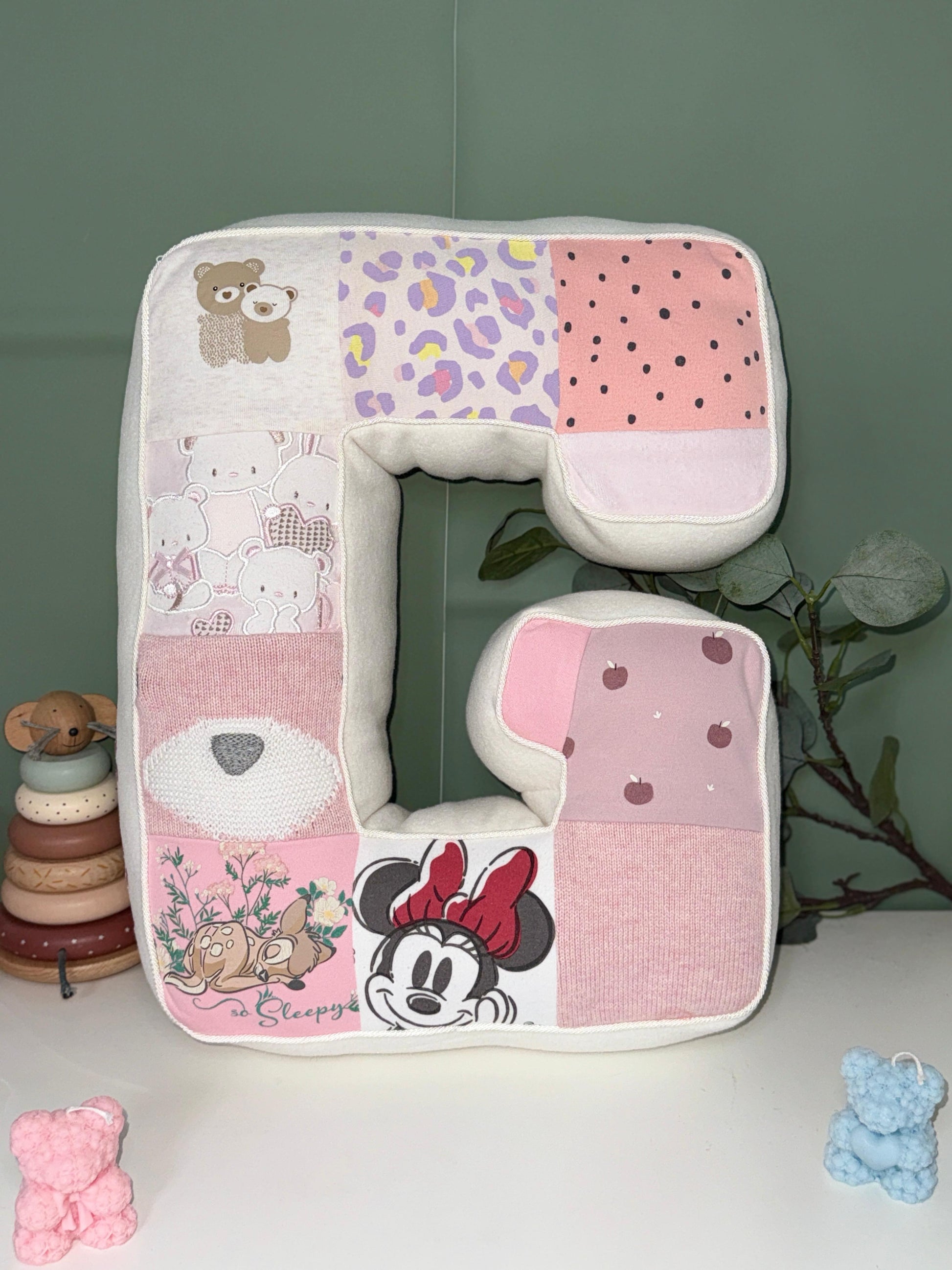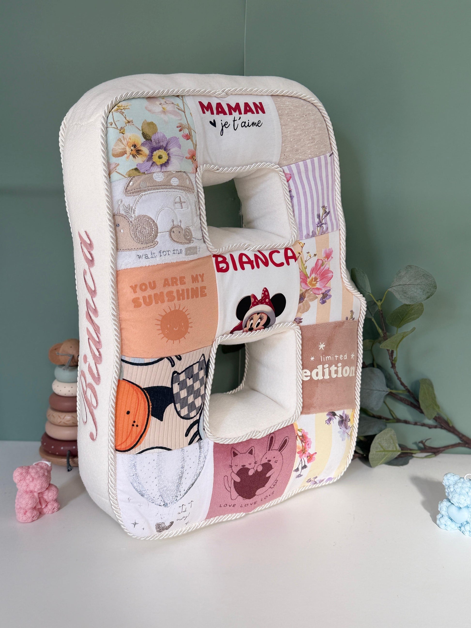 La Memento Alphabet è un morbido cuscino a forma di lettera dell’alfabeto, realizzato interamente da 8 a 20 capi (a seconda della lettera) del tuo bambino o dei suoi familiari: tutine, body, magliette o pigiami che non usi più, ma che portano con sé storie indimenticabili.